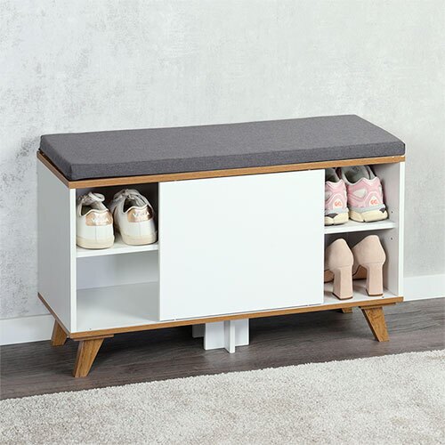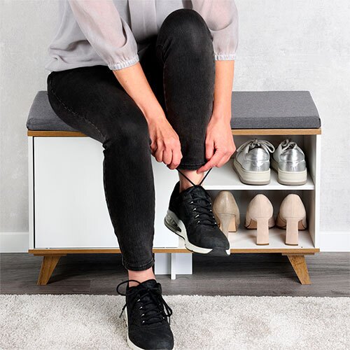 Der er plads til ca. 8 par sko. Praktisk måde at få styr på skoene i entréen, hvor du også har en polstret siddeplads, når der skal skiftes sko. Skobænken er nem at samle og leveres med alt, hvad du skal bruge. Tåler maksimal belastning på ca. 110 kg.