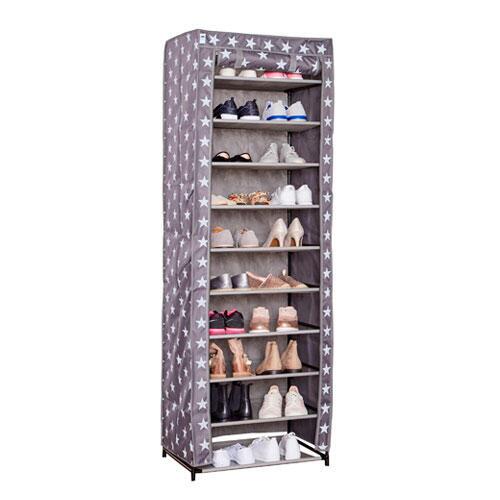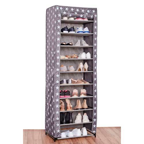 Praktisk skoskab, der er fremstillet i pulverlakeret metal med polyester overtræk i grå farve med hvide stjerner og hvid lynlås. Tidløst design fra tyske Store It, der kombinerer praktisk funktionalitet og design på bedste vis. Forsynet med hele ti hylder til skoopbevaring. Særligt velegnet til mindre gangarealer, entré og værelser.