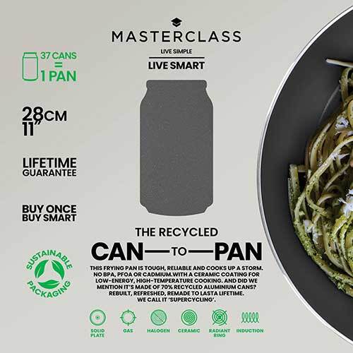 Her kan du få fingrene i den helt nye, innovative og langtidsholdbare Can-to-Pan stegepande fra engelske KitchenCraft. Can-to-Pan serien bringer køkkentilbehøret ind i en grøn fremtid, da serien er fremstillet af 70% genbrugt aluminium fra dåser. Du får stadig en præcis lige så robust og pålidelig stegepande som var det et hvilket som helst andet MasterClass produkt. Stegepanden har en solid letvægts konstruktion, der gør den helt perfekt til madlavning i hverdagene.