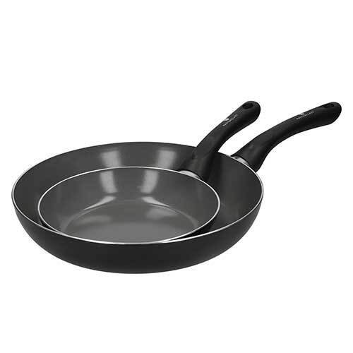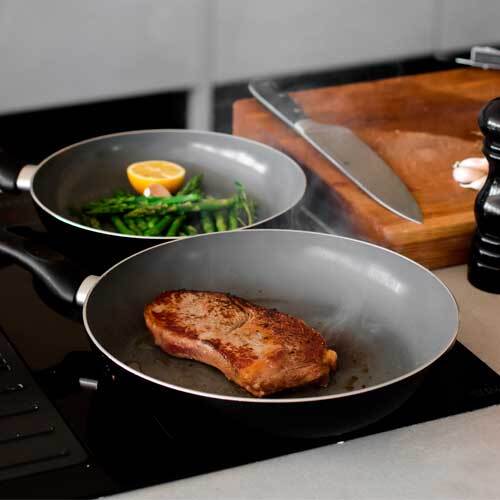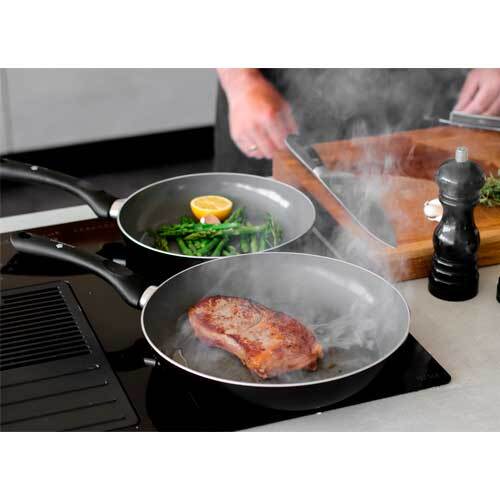 Forsynet med ridsefast non-stick belægning, der er så effektiv, at du kan nøjes med begrænset brug af olie under madlavningen. Konstruktionen af aluminium sikrer ligeledes en hurtig og jævn opvarmning af stegepanderne, hvilket gør dem energibesparende og tidsbesparende. Der er anvendt hhv. 19 og 37 genbrugsdåser til fremstilling af disse stegepander.