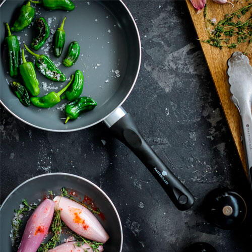 Her kan du få fingrene i det helt nye, innovative og langtidsholdbare Can-to-Pan stegepandesæt fra engelske KitchenCraft. Can-to-Pan serien bringer køkkentilbehøret ind i en grøn fremtid, da serien er fremstillet af 70% genbrugt aluminium fra dåser. Du får stadig en præcis lige så robust og pålidelig stegepande som var det et hvilket som helst andet MasterClass produkt. Stegepanderne har en solid letvægts konstruktion, der gør dem helt perfekte til madlavning i hverdagene.