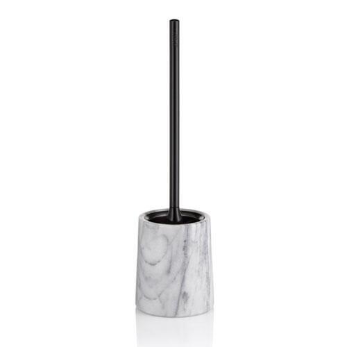 Eksklusivt Varda toiletbørste sæt, der er fremstillet i ægte marmor med lækkert, hvidt finish. Håndtaget er fremstillet i metal med sort lakering. Forsynet med indvendig plastbeholder, udskifteligt toiletbørstehoved, samt filt under bunden af toiletbørsteholderen.