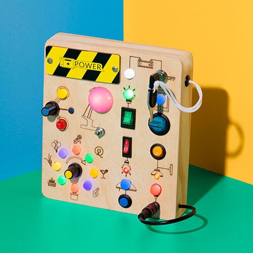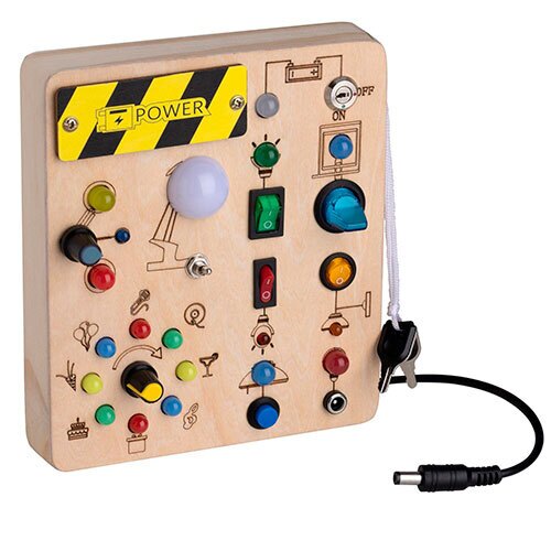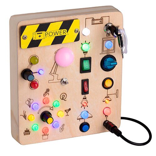 Stimulerende aktivitetstavle med 19 LED lys og en masse knapper som dit barn kan trykke på for at tænde og slukke de forskellige lys. Fremstillet i en blanding af træ, plast og metal. Tavlen kan bruges af børn, der er ældre end +3 år og den skaber med garanti en stor underholdningsværdi.
