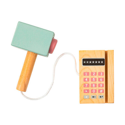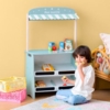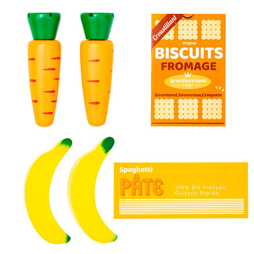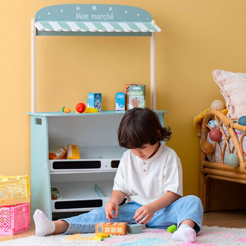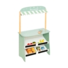 Sjov købmandsbutik til børneværelset, der kommer fra franske Atmosphera. Udført i fin kvalitet og fremstillet i robust MDF træ med lysegrøn og hvid lakering. Markedsboden er forsynet med to skrå hylder under bordpladen, der er beregnet til opbevaring af købmandsvarerne. Her får børnene rigtig mange timers sjov og spas, samt mulighed for at lege kreativt med det medfølgende tilbehør. Regnemaskinen og tilbehøret i frugt og grønt er også fremstillet i træ, mens æskerne er udført i pap.