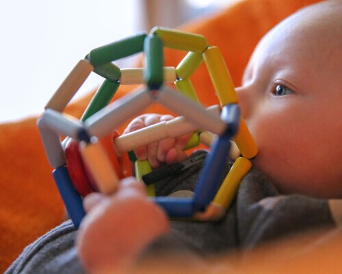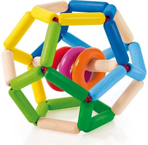 Den kan klemmes, presses og rulles til babyens hjertes lyst! Den farverige, lette bold har den fascinerende evne altid at vende tilbage til sin oprindelige form. De store åbninger er perfekte til at gribe fat i alle de små stænger. De farverige rangleringe belønner babyens ivrige bevægelser med en spændende ranglen. Fremmer de sensoriske færdigheder.